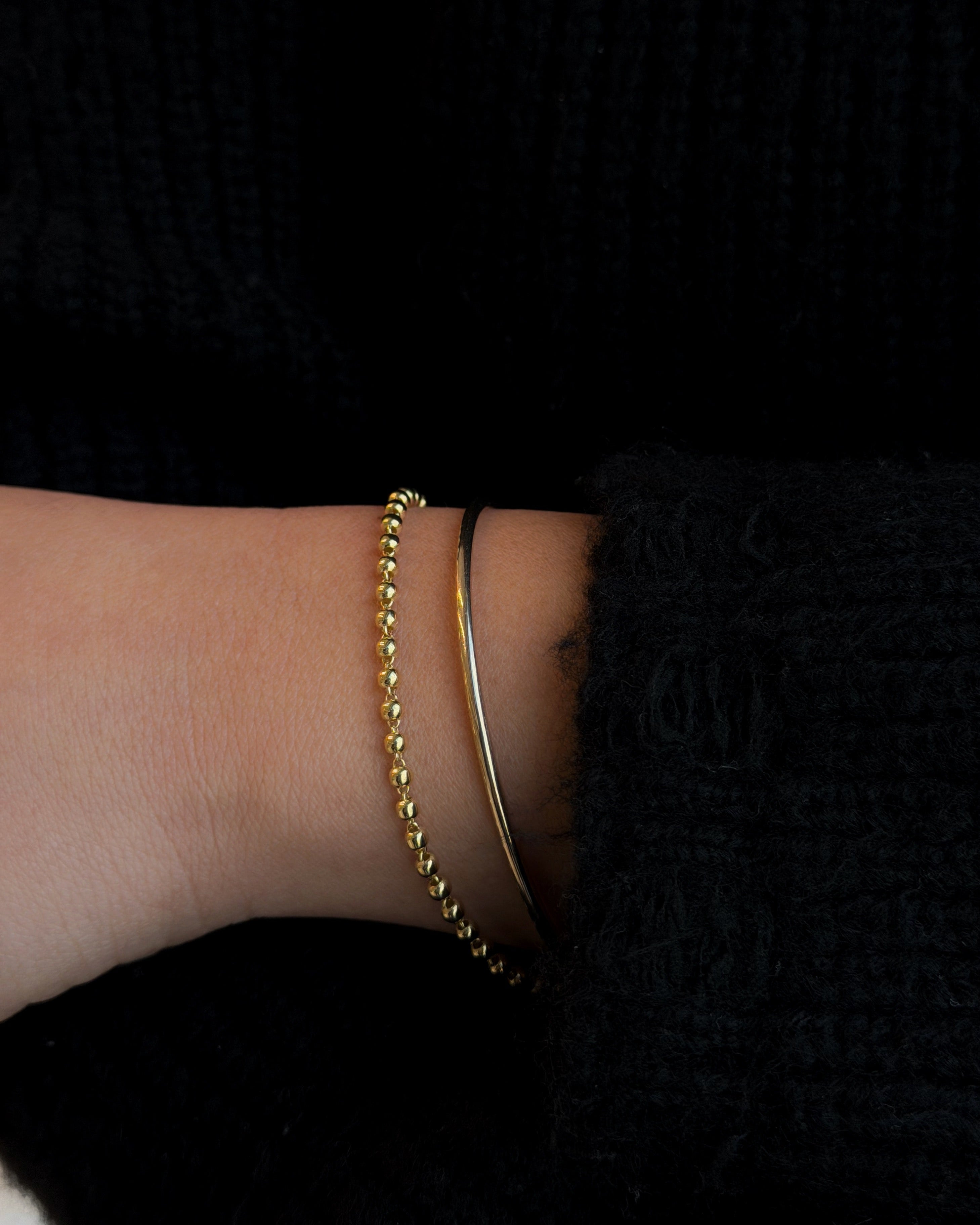 The Bold Bubble Bracelet is crafted in 18K solid gold, with smooth rounded beads that catch the light from every angle. Clean lines. Soft shine. Strong presence.