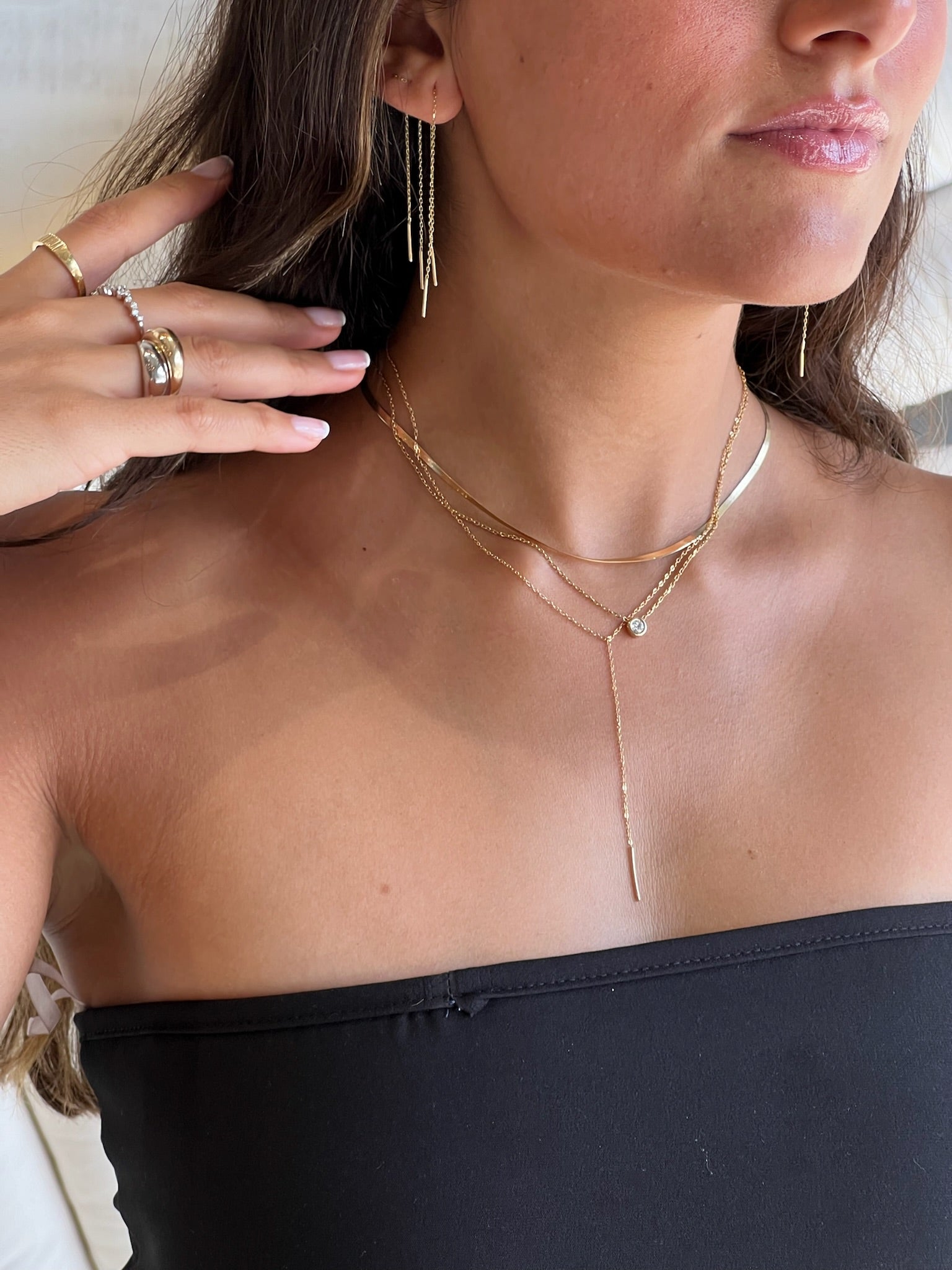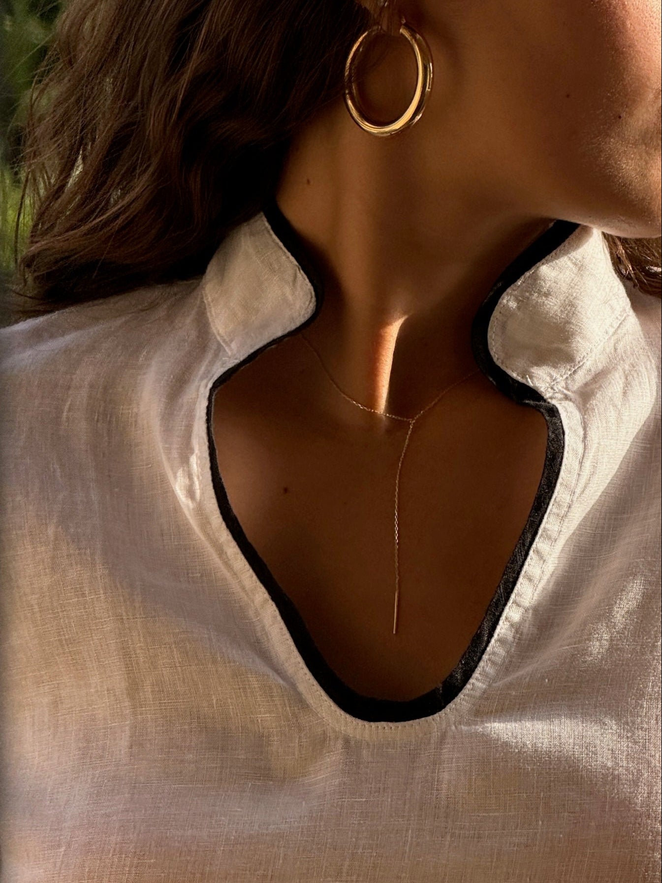 Discover the dainty lariat of your dreams! This elegant piece features a delicate chain with a minimalist drop, designed to add a touch of sophistication to any outfit. Perfect for layering or wearing solo. this lariat necklace is a must-have in your jewelry collection.