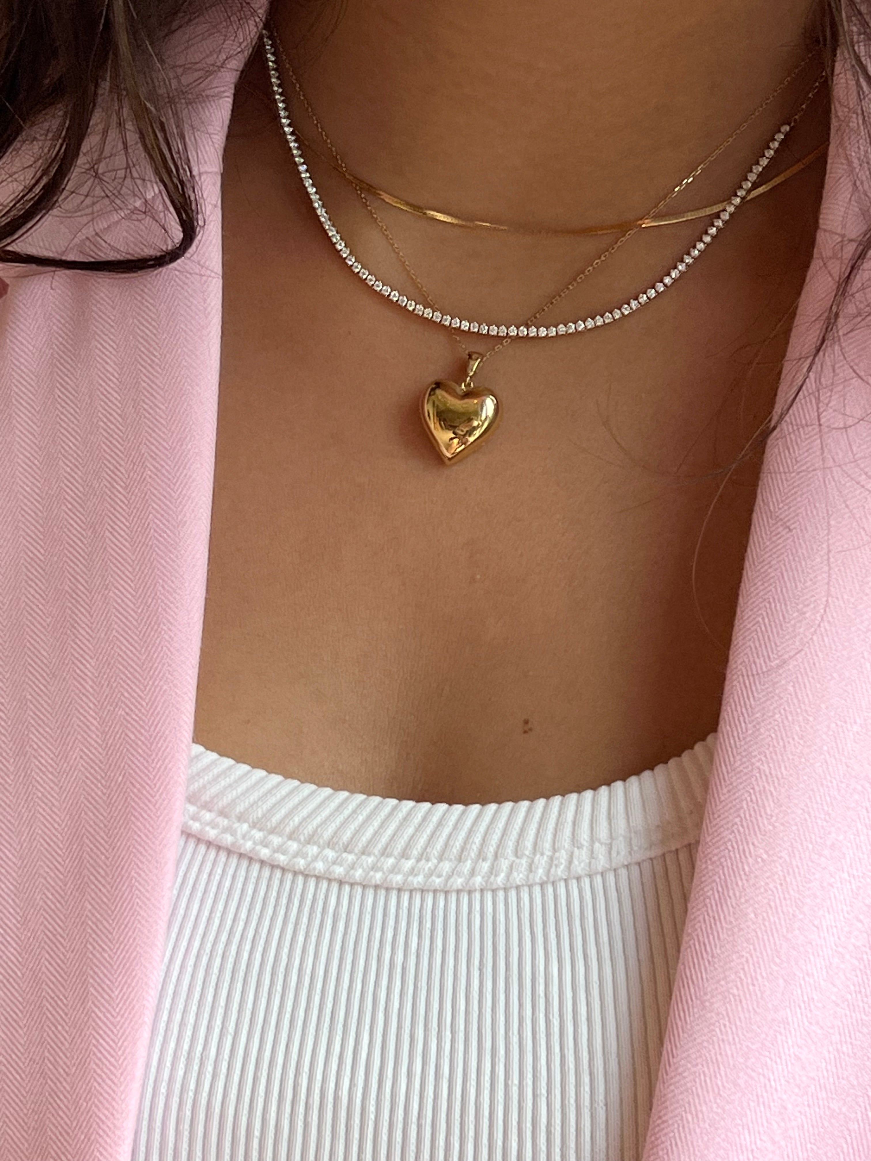 This gold puffy heart pendant is a timeless symbol of love and elegance. Its softly rounded design catches the light beautifully, adding a subtle glow to any look. Whether worn alone for a minimalist touch or layered for a bolder statement, this piece effortlessly blends romance with everyday sophistication.