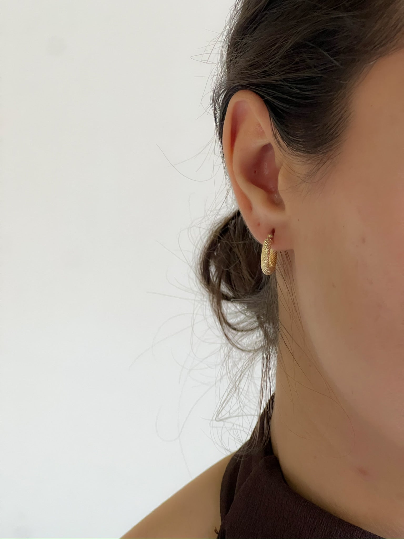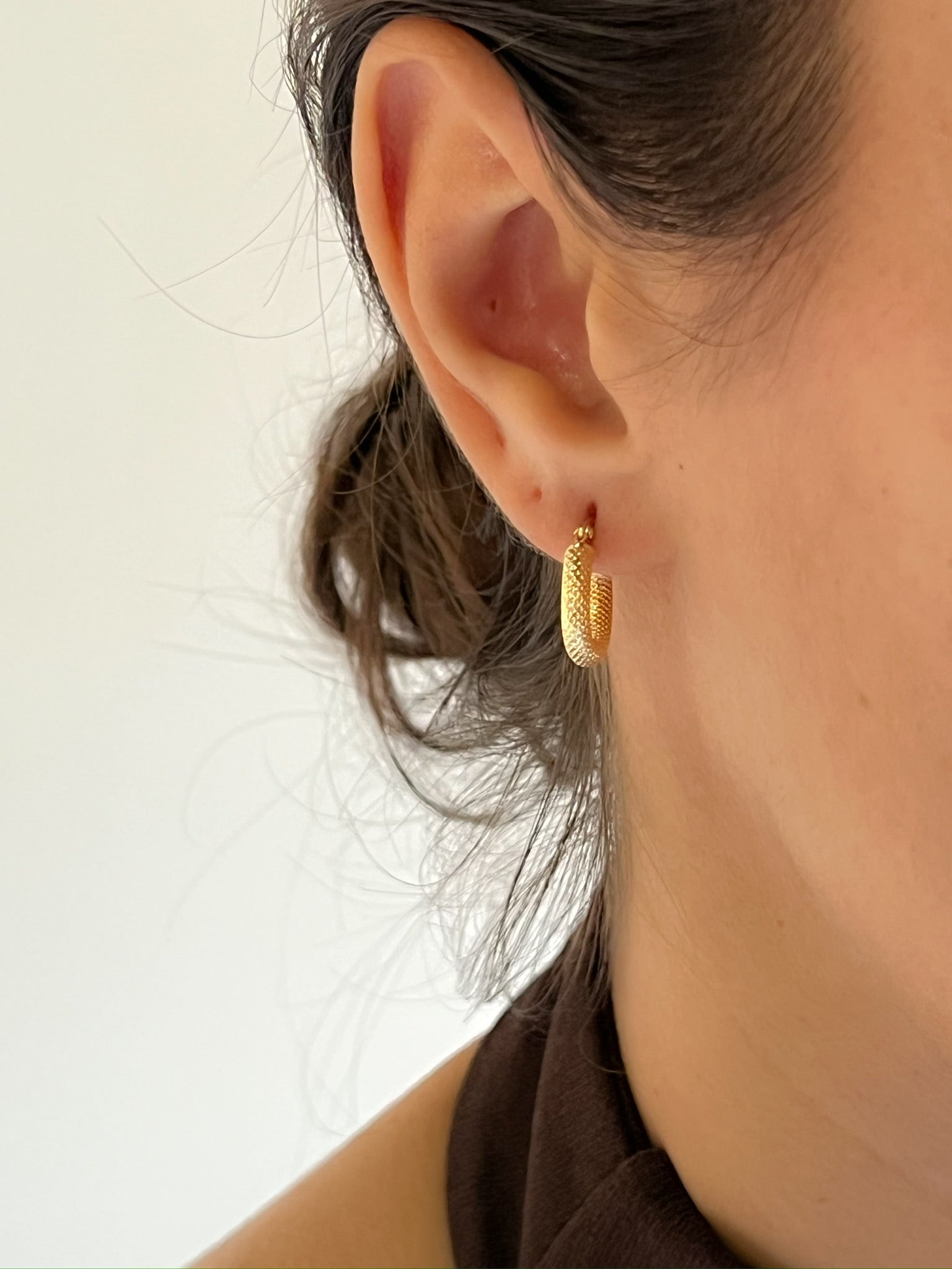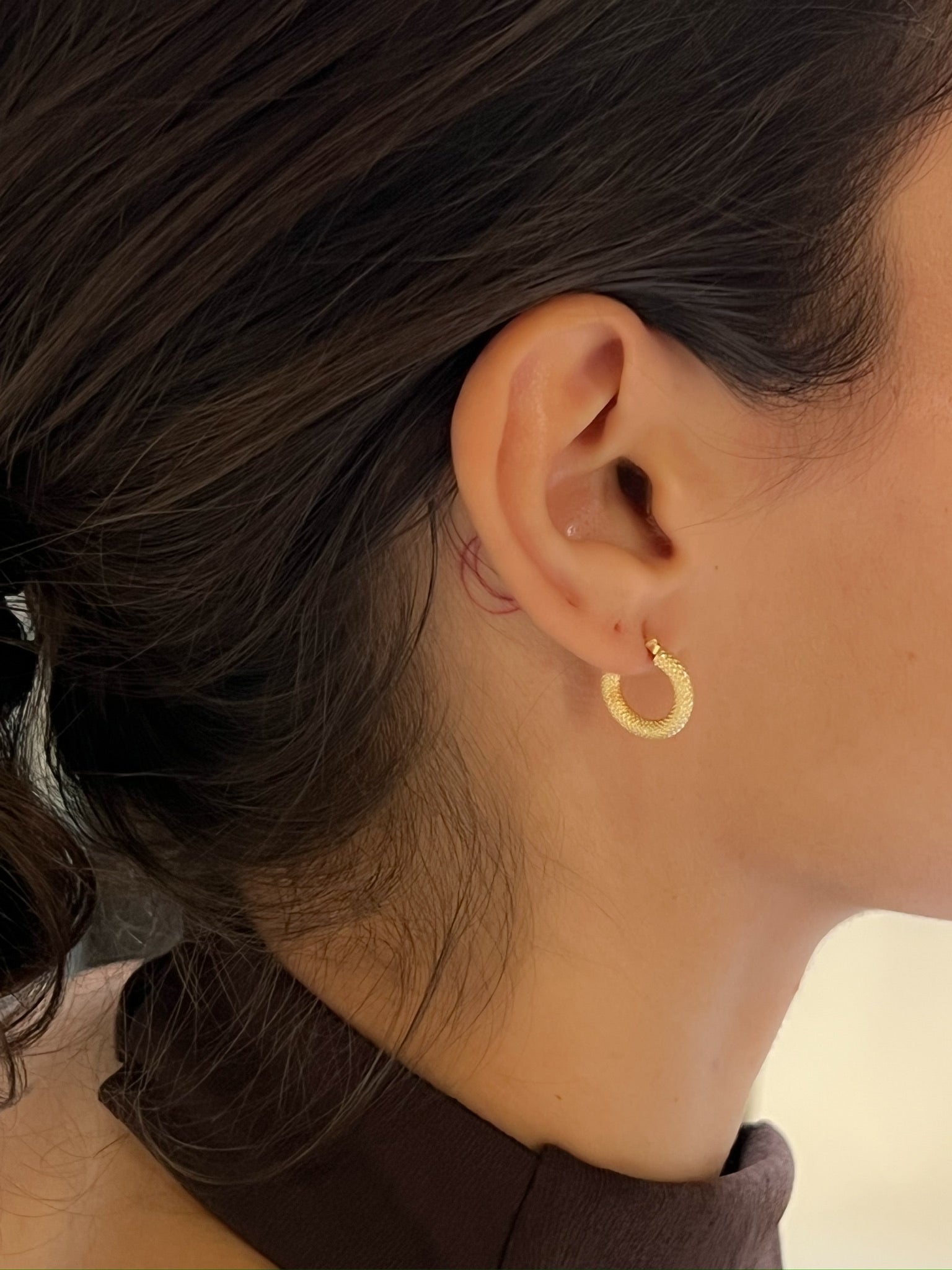 These 18K solid gold serpent hoops are designed to make a bold yet elegant statement. Inspired by the beauty of snakeskin, their textured surface features intricate diamond-cut detailing that mimics the scales of a serpent, adding depth and a subtle shimmer as they catch the light. Lightweight and versatile, they bring a unique edge to any look while maintaining a timeless appeal.