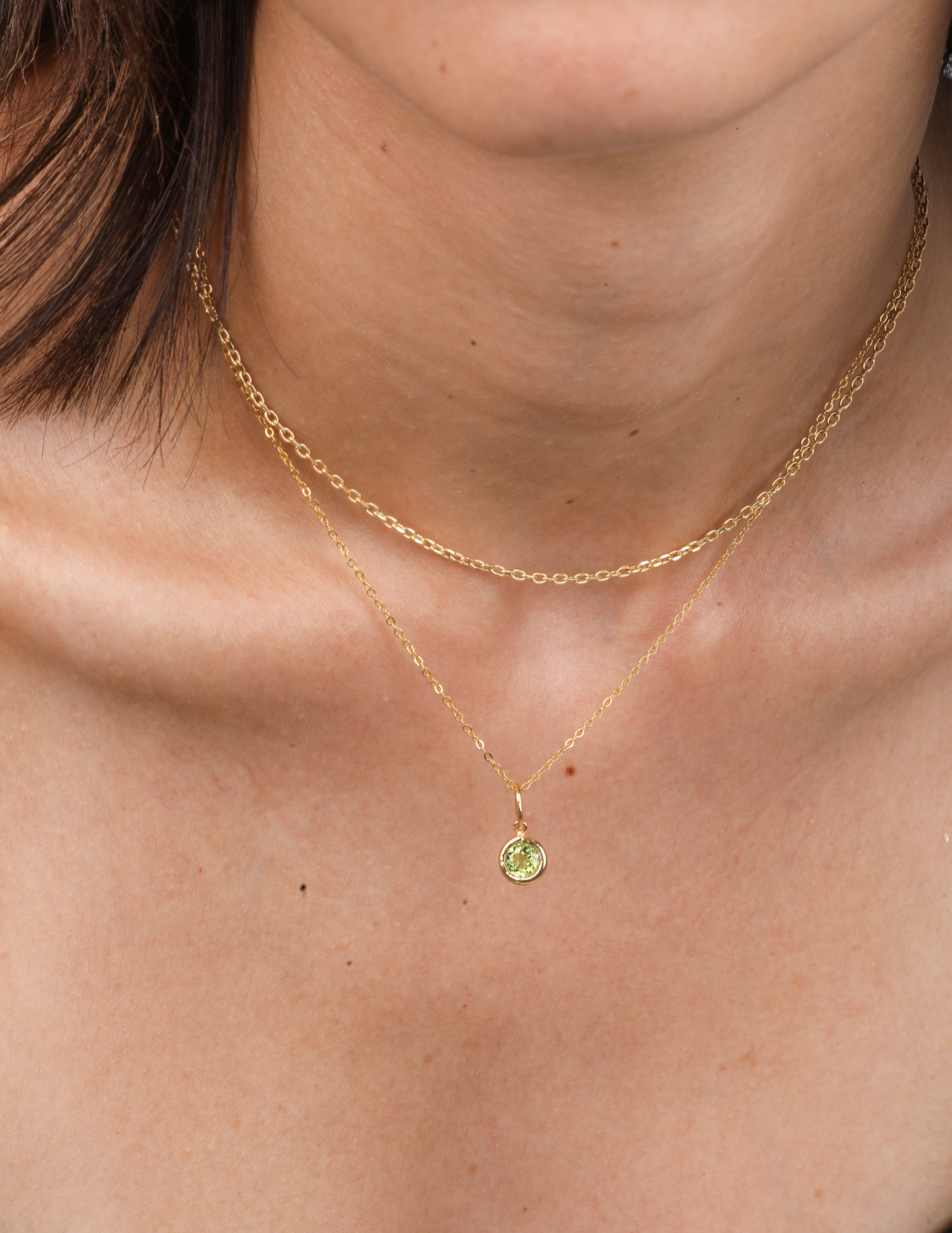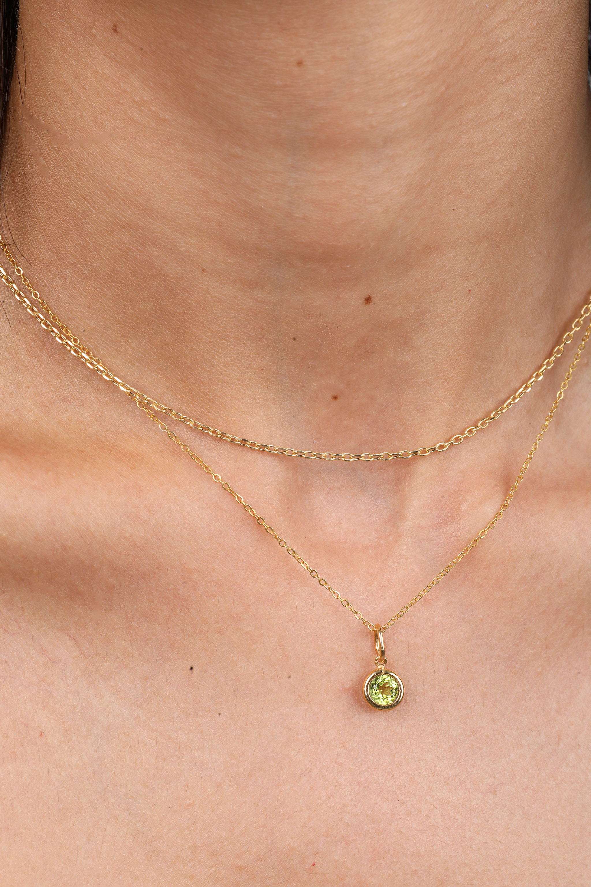 Achieve a stunning look with this Green Peridot Round Pendant. The pendant is crafted from solid gold and is set with a stunning green peridot stone that will make any outfit pop. Perfect for summer days and nights, this pendant is sure to turn heads wherever you go.