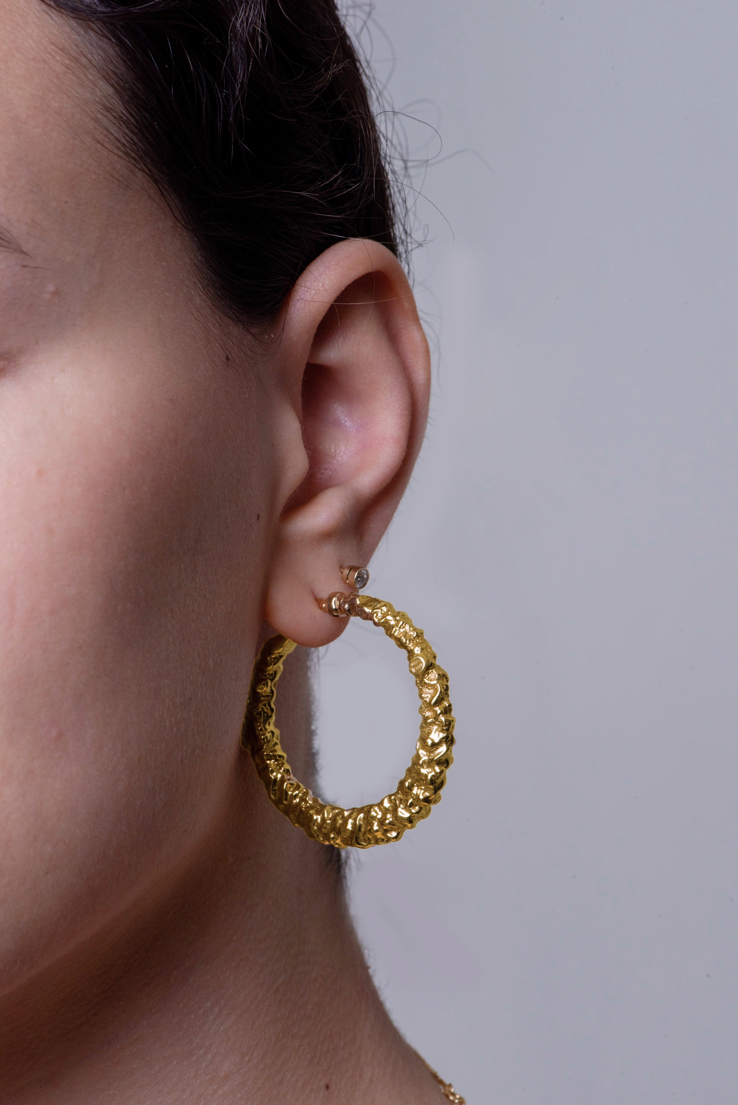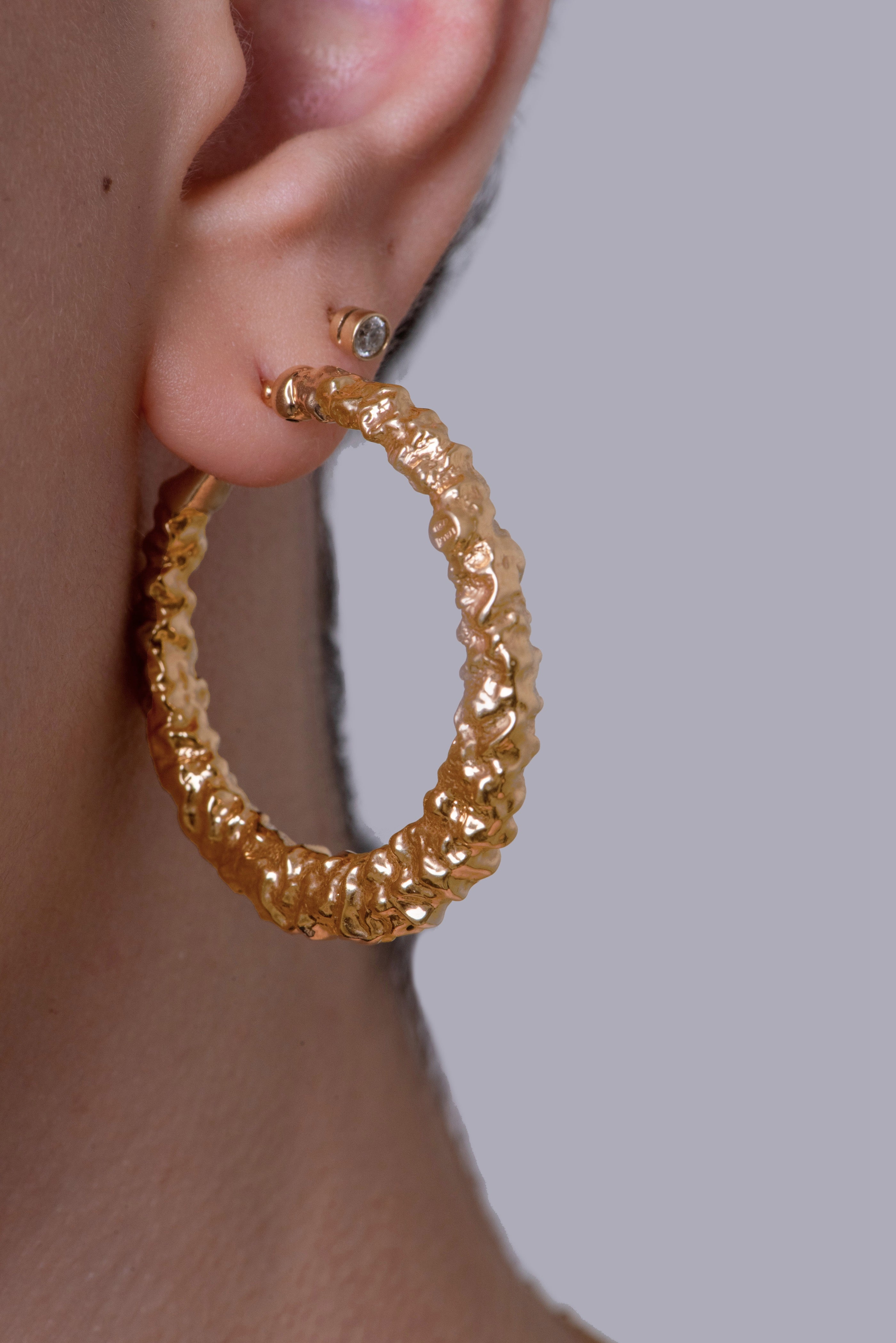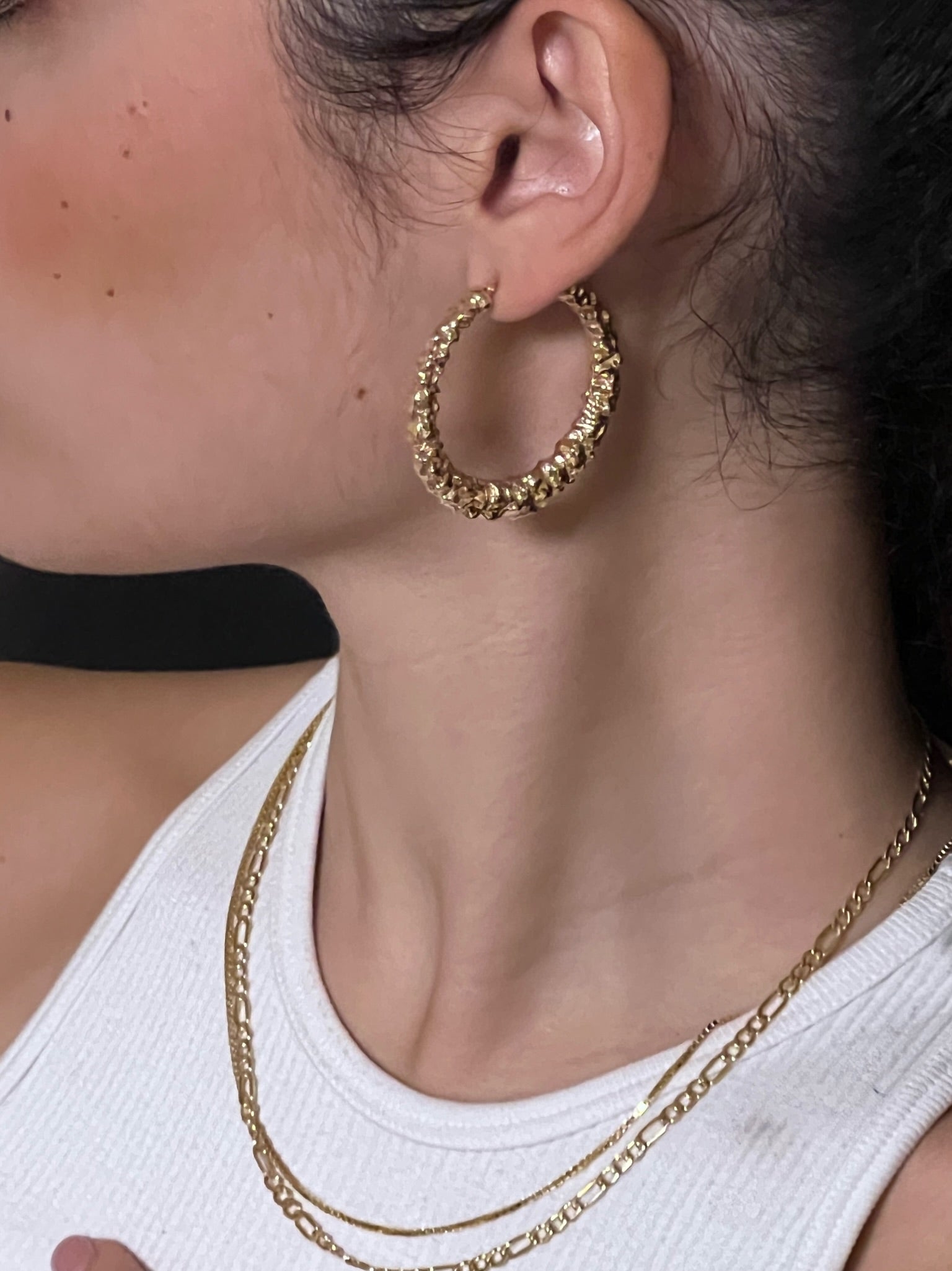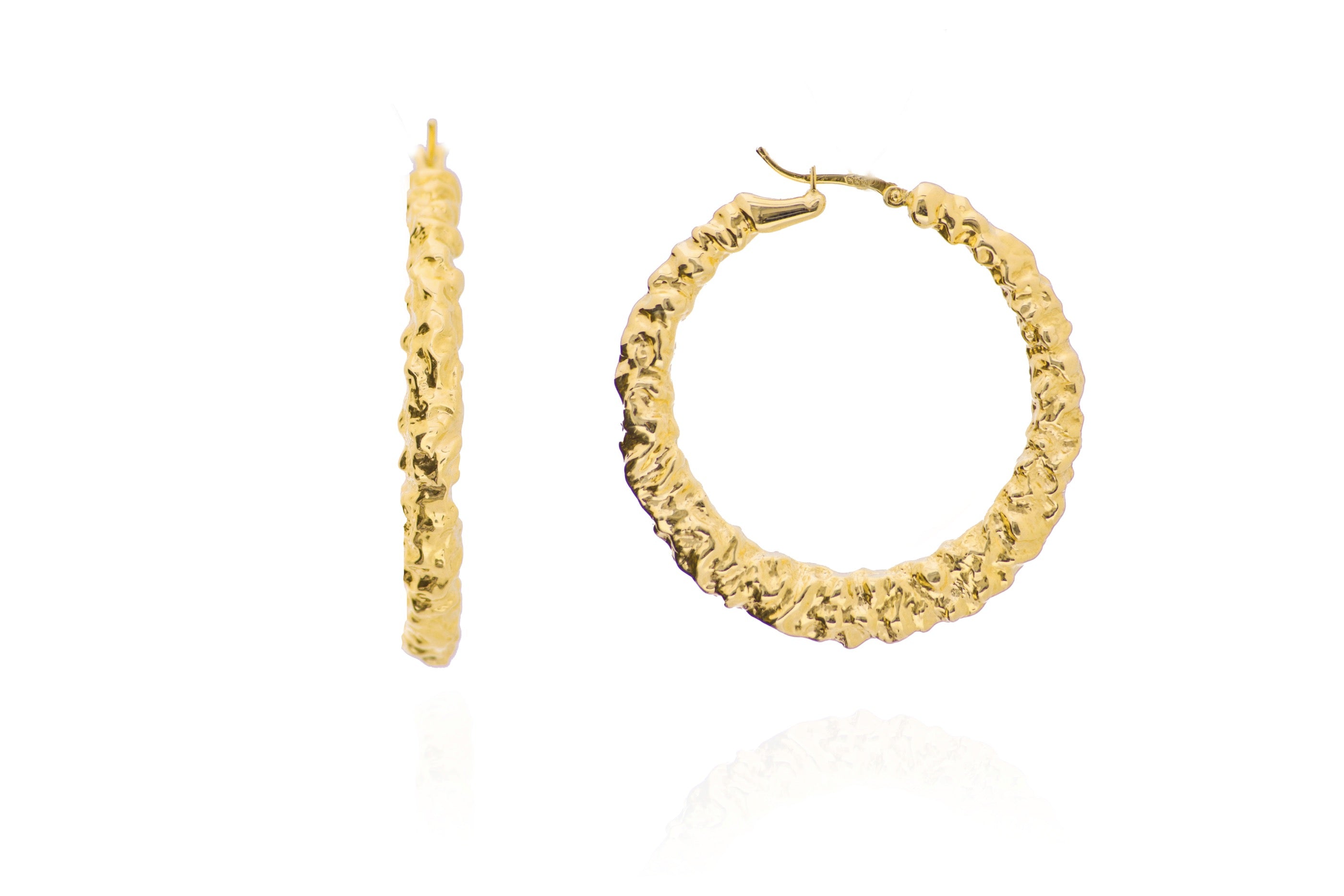 Make a bold statement with these hammered textured hoops. This classic design will add a perfect touch of style to any outfit. Whether you wear them alone or pair them with other hoops, these hoops will be sure to turn heads.