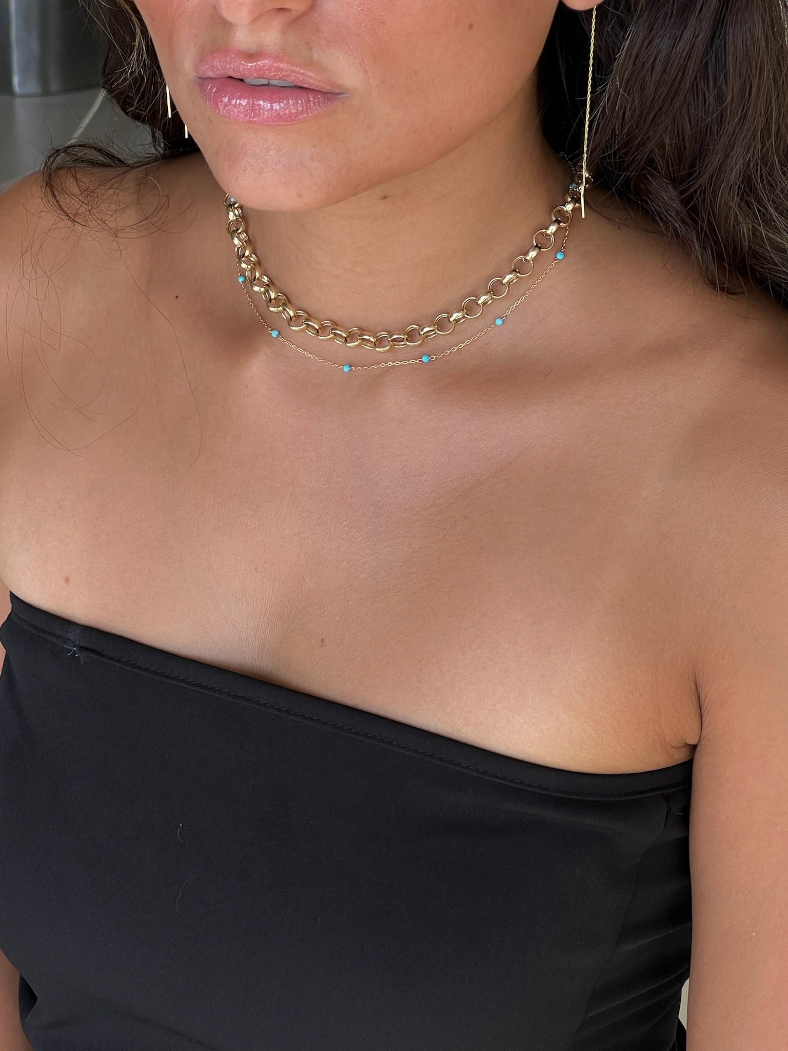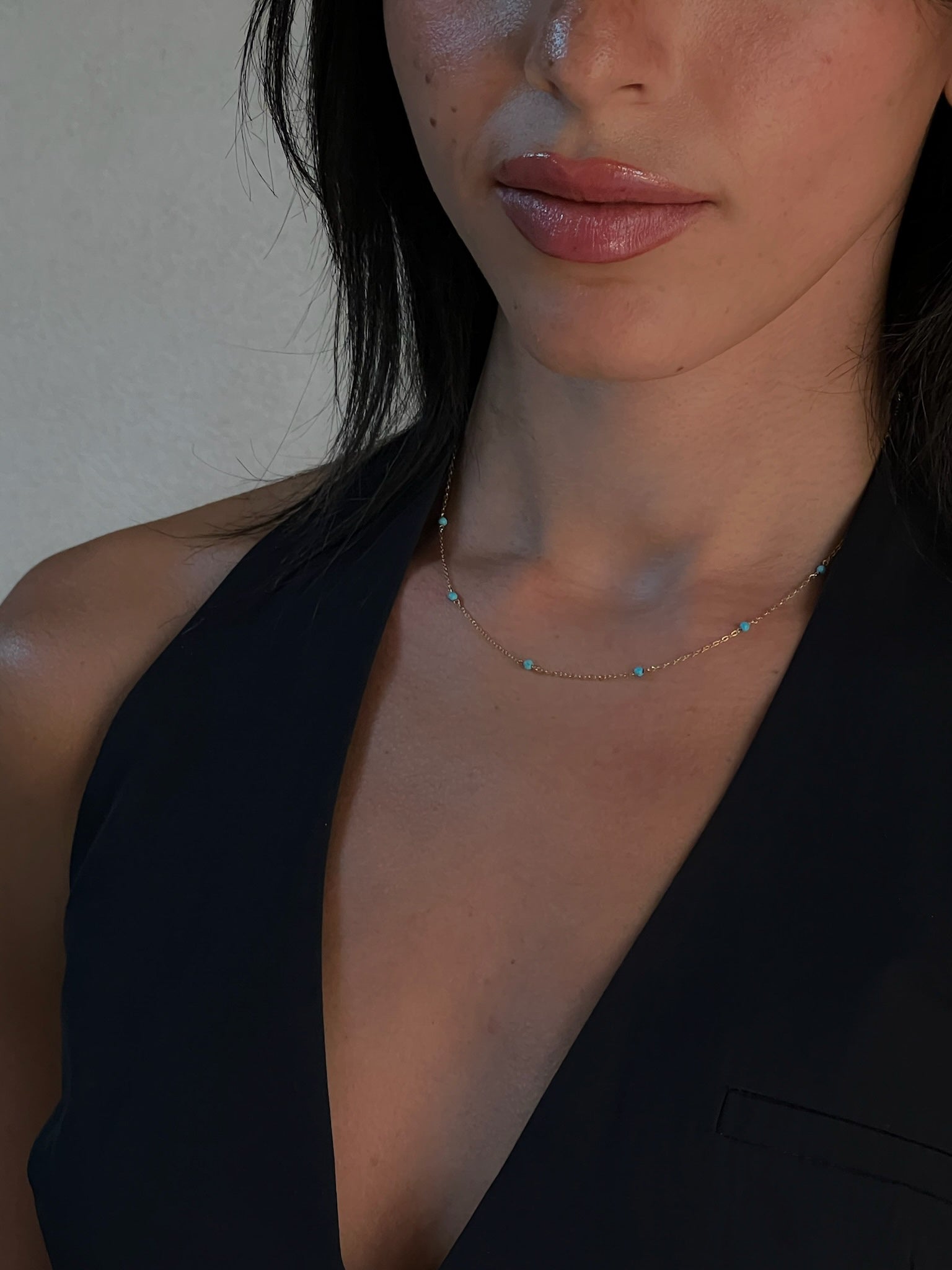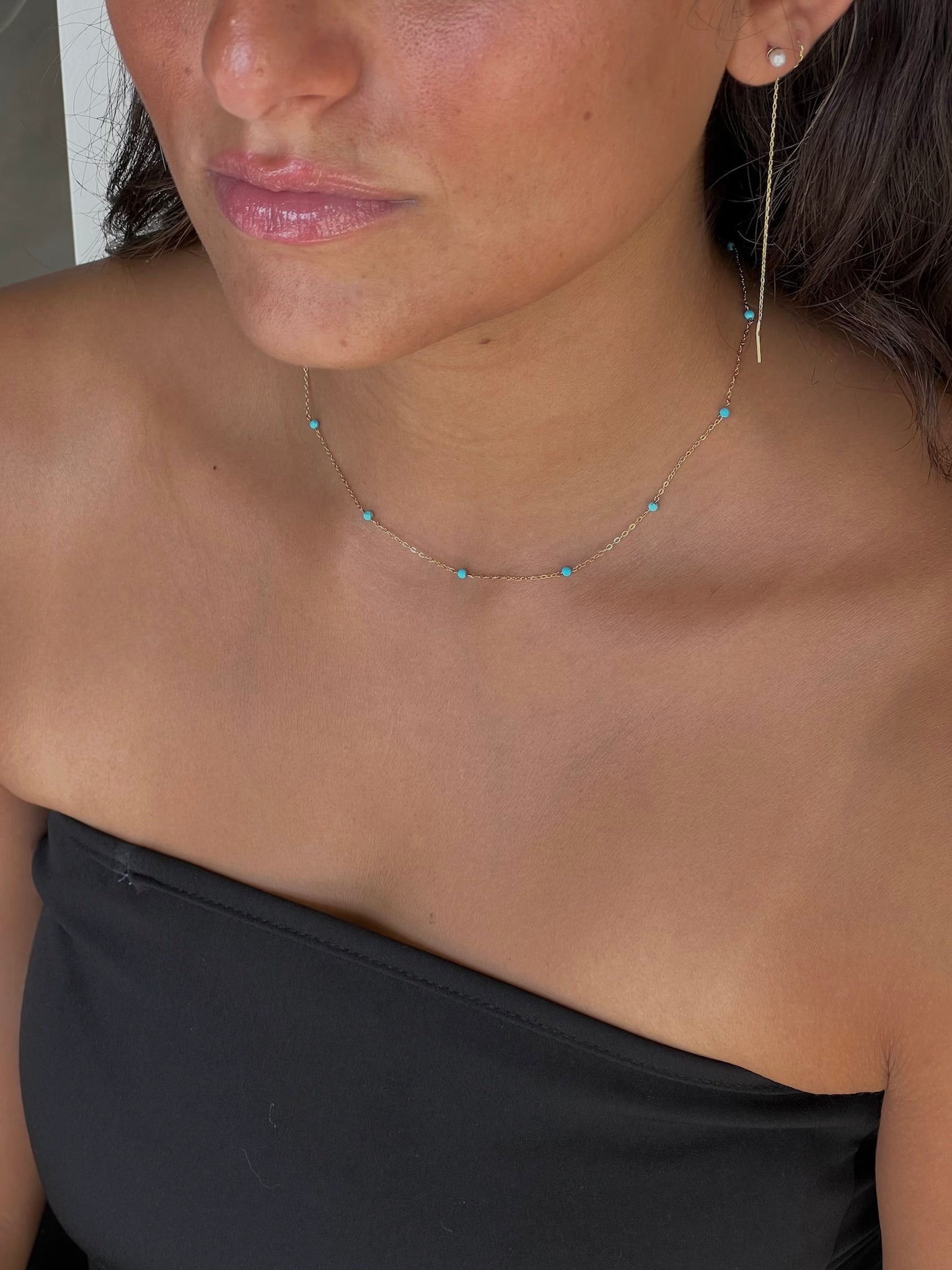 This Turquoise station necklace features delicate, evenly spaced stones set along a sleek chain, combining simplicity with a vibrant pop of color. Each Turquoise gemstone adds a touch of earthy elegance, making it perfect for layering or wearing solo.