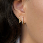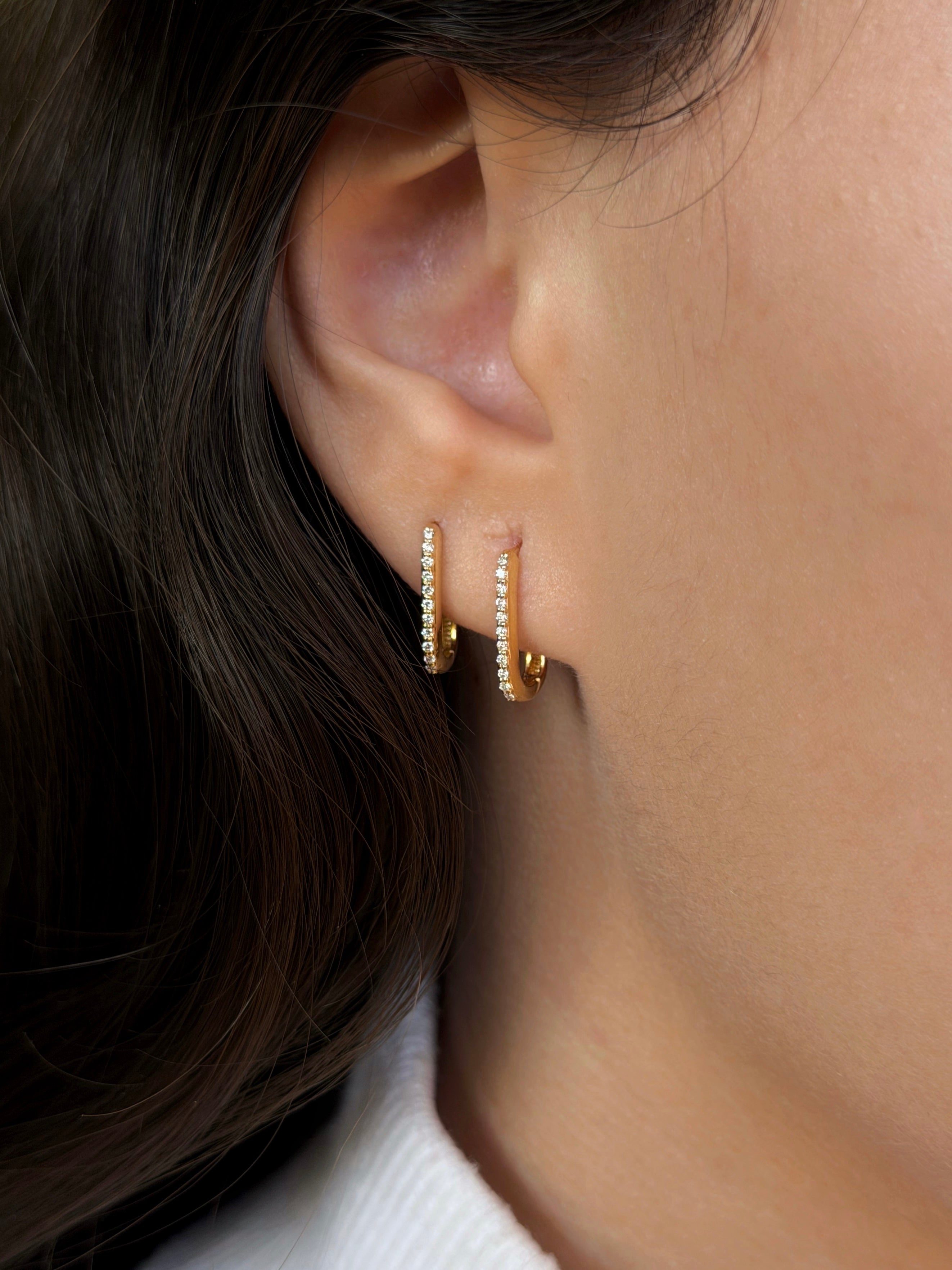 These Hoops change the balance of an ear. They sit with intention, bringing a sharper edge to soft looks and structure to minimal ones. The diamonds feel deliberate and directional, giving the piece a styled, finished quality rather than a decorative one. It is the kind of earring you reach for when you want the look to feel considered, not added on.
