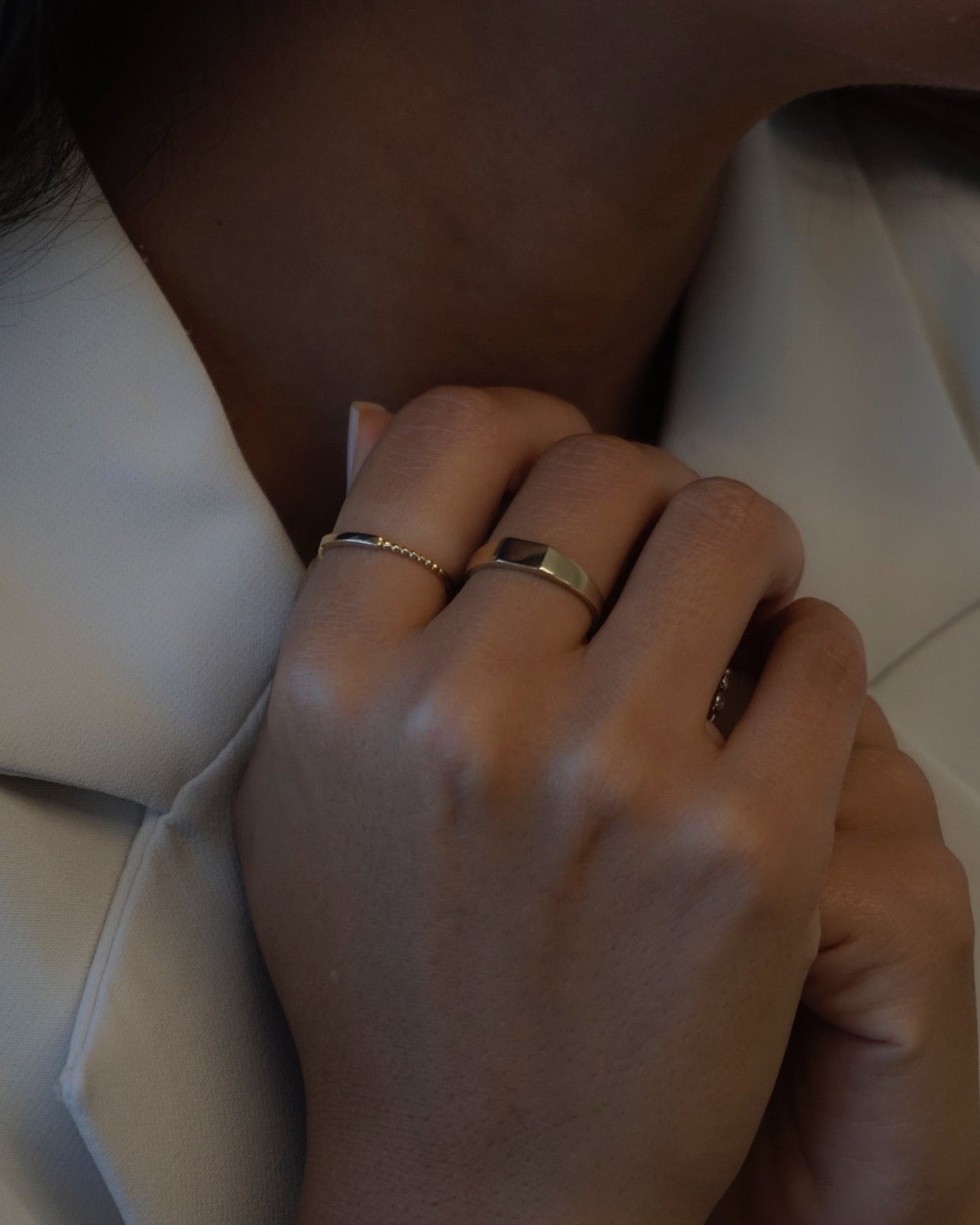 The Bar Beaded Ring plays with contrast in all the right ways. Clean lines meet rounded beads to create a rhythm that feels balanced, bold, and a little unexpected. Crafted in solid 18K gold, designed to shine without trying.