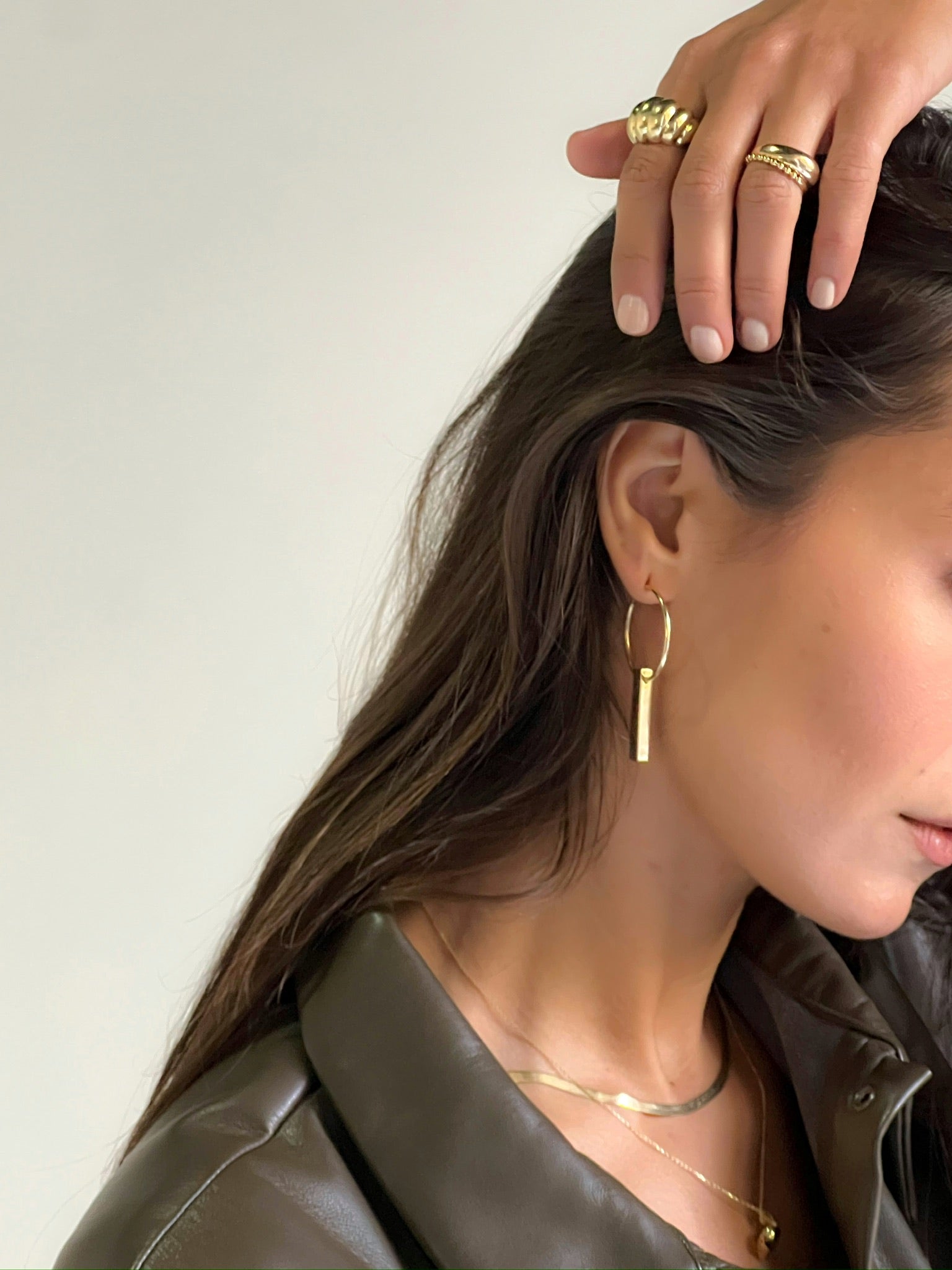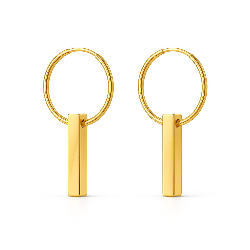 These geometric drop hoops are a sleek, sculptural twist on a classic silhouette. Featuring minimalist hoops paired with bold rectangular bars.