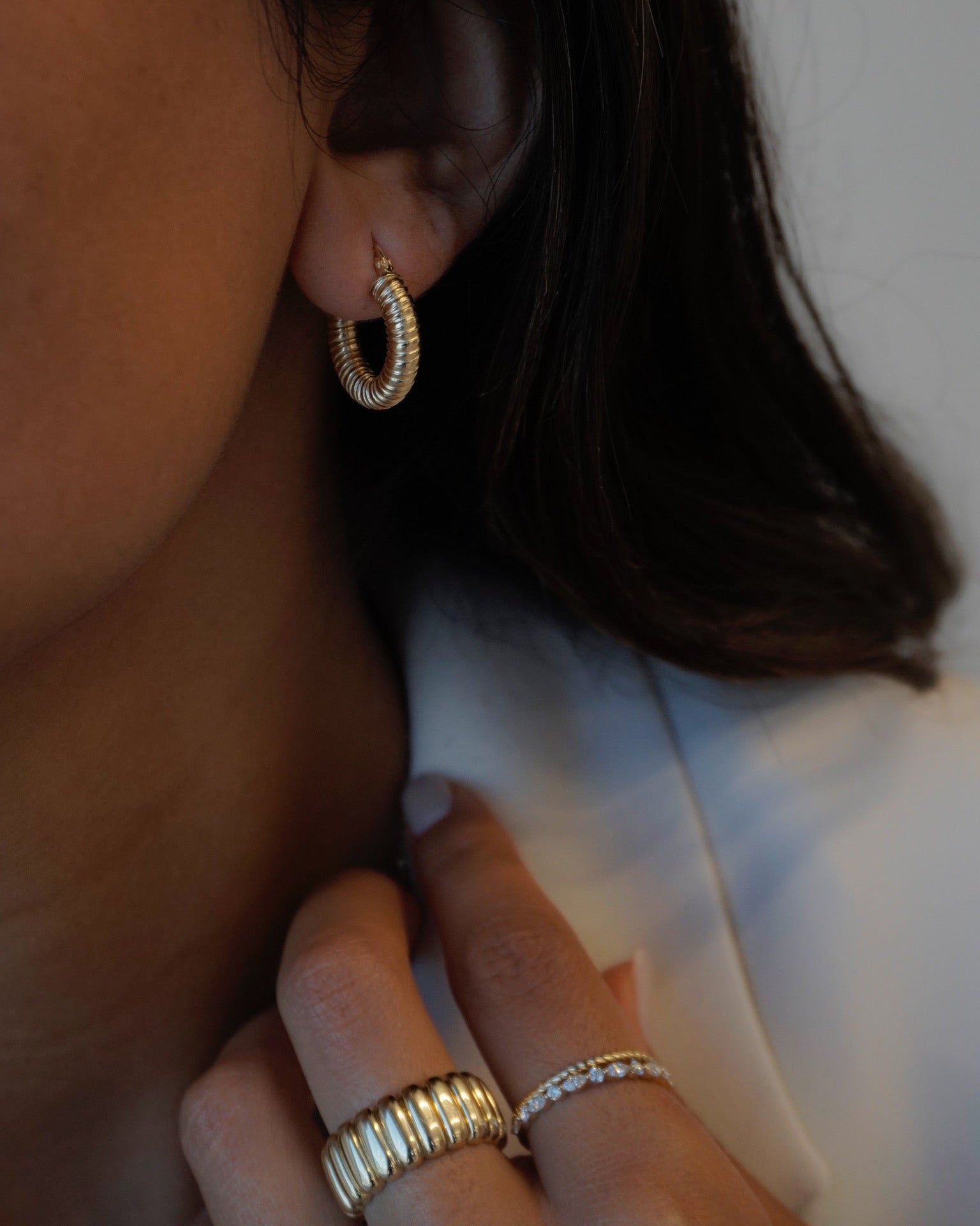 Defined by a rich, ribbed texture and a soft rounded tube form, the Tube Snail Hoops bring depth and shine to your everyday hoops. Made in 18K solid gold, they are smooth, comfortable, and designed to be worn effortlessly from morning to night.